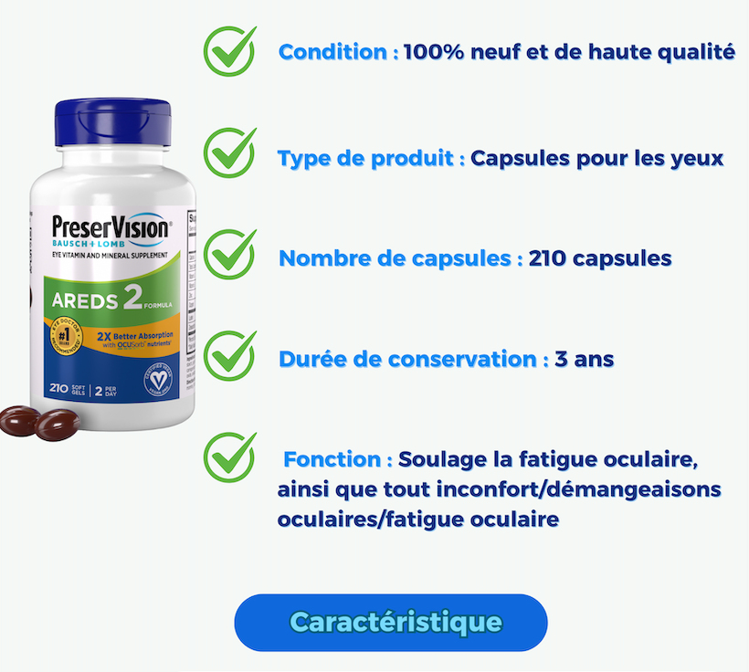 Contient de la Lutéine, Zéaxanthine, Zinc, Cuivre, Vitamine C et E pour nourrir vos yeux en profondeur et filtrer la lumière bleue nocive.